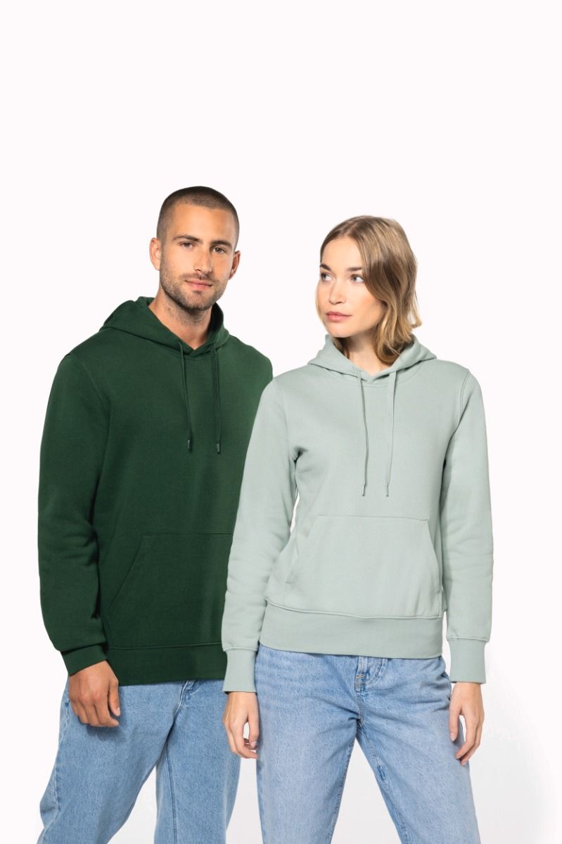 | Omschrijving | 85% katoen / 15% polyester. Gemaakt van 85% biologisch katoen en 15% gerecycled polyester. De GOTS-labels (Global Organic Textile Standard) worden afgeleverd door Ecocert Greenlife. Geborsteld fleece 3 draden LSF (Low Shrinkage Fleece) aan de binnenkant. Enzymgewassen. Gekamd katoen. Rechte snit. 1x1 ribboord in buisconstructie voor een betere afwerking aan de mouwuiteinden en de onderkant. Kangoeroezak. Gevoerde capuchon 100% katoen, jerseykatoen 180 g. Nektape in ton-sur-ton jersey en halvemaanvormige afwerking aan de binnenkant van de kraag. Afwerking dubbel stiksel aan de mouwuiteinden, onderkant en hals. Geen merklabel in de kraag, maar enkel een maatlabel voor eenvoudige personalisatie. |