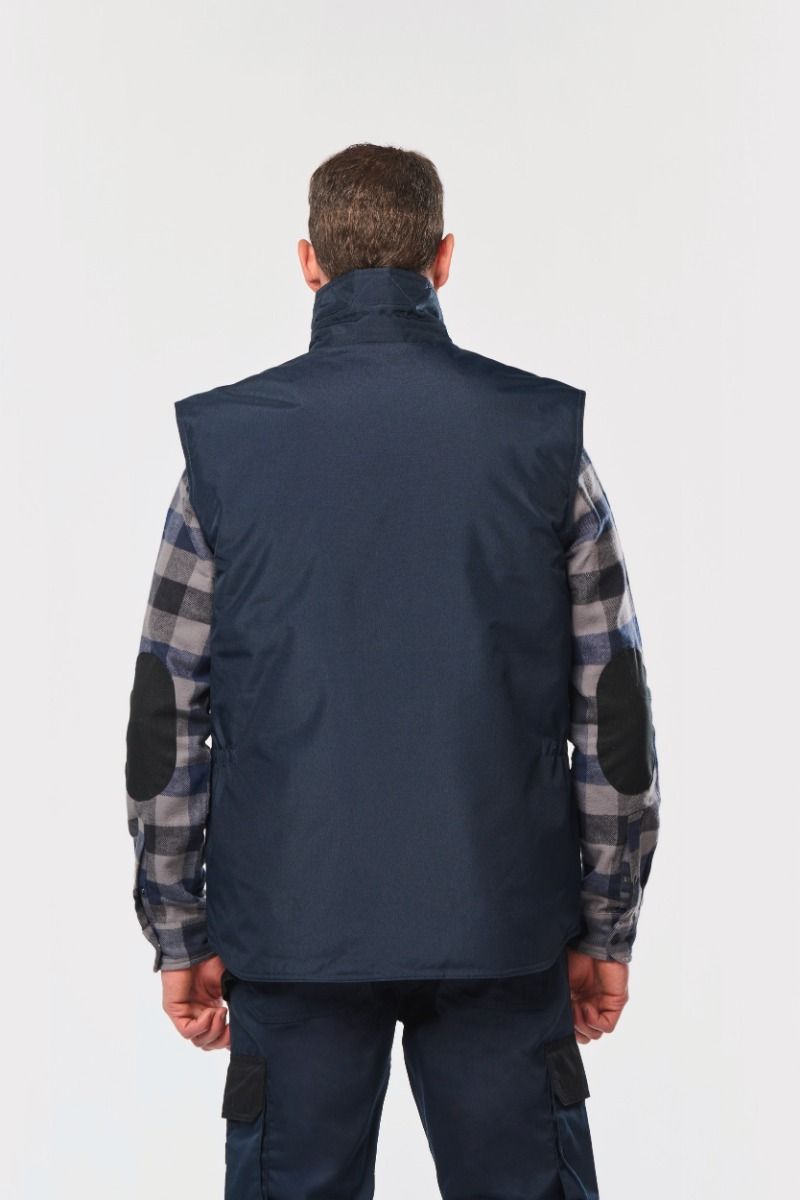 | Omschrijving | 100 % polyester. Buitenkant: 100% oxford polyester met PVC inductie. Gewatteerde voering met 100% polyesterwatten. Ritssluiting verborgen onder een lijst met drukknopen. 4 buitenzakken (3 met overslag en 1 met rits). Elastische armsgaten en regelbaar met een stopper. 2 binnenzakken (1 met rits en 1 gsmzakje). Drukkersrits. Gemiddeld gewicht in maat L: 916 g. |